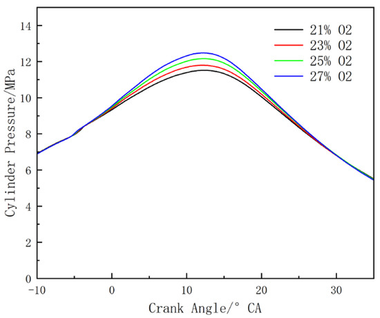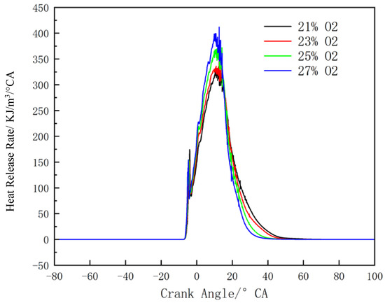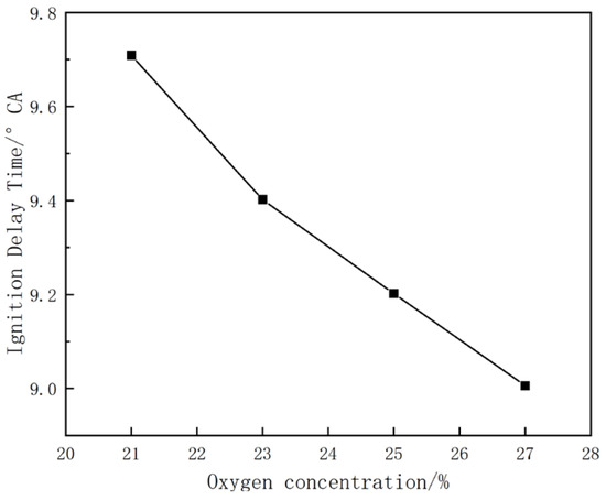 Figure 11 presents the connection between the cylinder pressure curve and the crankshaft angle under diverse oxygen concentrations. It is observable that during the compression stage, the influence of oxygen concentration on cylinder pressure is not prominent. With the rise of oxygen concentration, the peak cylinder pressure slightly ascends. When the oxygen concentration is 27%, the peak value increases by approximately 8.3% compared to when it is 21%. Figure 12 depicts the comparison of ignition-delay time under different oxygen concentrations. In this paper, ignition-delay time is defined as the period between the injection time and CA10. From the graph, it can be noticed that the ignition-delay time reduces as the oxygen concentration increases. The shorter the ignition-delay time, the more easily the diesel engine can start. Figure 13 demonstrates the impact of oxygen concentration on the heat-release rate. As can be seen in the figure, the peak heat-release rate rises with the increase in oxygen concentration. This is because an increase in oxygen concentration leads to the acceleration of the chemical reaction rate, an increase in exothermic rate, and the acceleration of the fuel pyrolysis rate, which eventually leads to the increase in cylinder pressure.