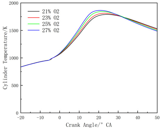 Variation in cylinder temperature with CA for different O2 concentrations.