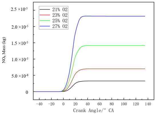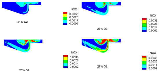 Figure 15 shows the relationship between NOx and crankshaft angle under different oxygen concentration ratios. Among them, NO is the main NOx emitted from the combustion of biodiesel. As shown in the figure, with the increase in oxygen concentration, the formation time of NOx is advanced, and the formation rate of NOx increases. This affects the final generation quality of NOx. The NOx emissions at an oxygen concentration of 27% are 7.08 times higher than the NOx emissions at an oxygen concentration of 21%. Figure 16 presents the distribution of NOx within the cylinder at various oxygen concentrations under CA50 conditions and with WR equaling 0. It can be observed from the figure that NOx is distributed in the cylinder, the cylinder wall, and the gap. As the oxygen concentration rises, the quantity of NOx produced increases.