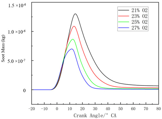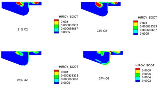 Figure 16 shows the NOx distribution in the cylinder at CA50 ATDC under different oxygen concentrations. The increase in oxygen concentration leads to the formation of soot, and the peak time occurs slightly earlier. The peak value of carbon soot generated at an oxygen concentration of 27% is reduced by 86.13% compared to 21%, and it is 2.8° CA earlier. Figure 17 shows soot distribution in the cylinder at CA50 ATDC under different oxygen concentrations. It can be seen that due to collision with the cylinder wall, a small amount of fuel accumulates at the bottom of the combustion chamber, while more fuel moves upward after colliding with the wall, resulting in more soot at the top of the cylinder head and the gap. At CA50, with the increase in oxygen concentration, the area where soot and dust are formed decreases. This is mainly because enriched oxygen air increases the combustion temperature and pressure inside the cylinder, making fuel molecules more prone to thermal decomposition. From Figure 18, it can be seen that when the oxygen concentration is 27%, the amount of soot produced is the lowest.