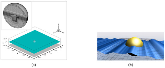 The CFD simulations of the TALOS buoy were performed using ANSYS® Fluent, Release 2021R2, as an unsteady Reynolds-averaged Navier–Stokes (URANS) simulation. Figure 4a illustrates the computational domain and overset mesh configuration used for the CFD simulation setup. The rectangular domain spans dimensions of 1 km × 1 km × 200 m, where the horizontal axes (X and Y) and vertical axis (Z) are shown in metres. The green fill represents the initial location of the air–water interface, which is set as a constant baseline in the simulation. The grey surface at the bottom indicates the stationary wall boundary condition, while symmetry boundary conditions are applied to the sides, and fixed pressure is maintained at the top boundary. The spherical overset zone, highlighted in the magnified insert, demonstrates mesh refinement near the TALOS buoy and the expected location of the free surface. Table 5 summarises the CFD setup parameters, including time-stepping and boundary conditions.