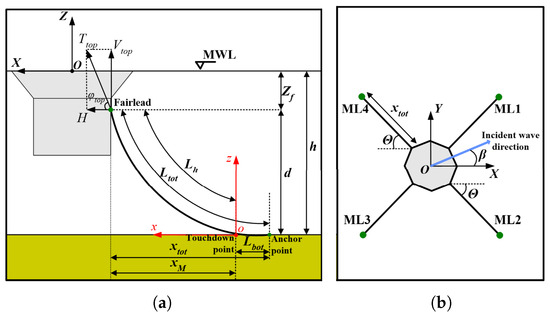 The mooring system plays a critical role in the hydrodynamic performance of the TALOS-WEC, affecting motion responses, energy absorption, and overall stability [69,70]. This subsection examines the system’s behaviour under two mooring configurations: slack (MLC1) and moderately slack (MLC2). Figure 6 illustrates the four-leg mooring system’s geometry and layout, emphasising the spatial arrangement and interaction of the mooring lines with the TALOS-WEC under wave conditions.