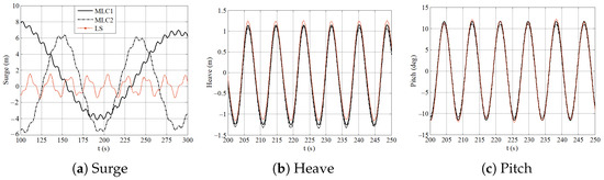 The time-domain impulse response functions (IRFs) provide intuitions into transient behaviours. Surge IRFs emphasize radiation damping and decay, heave IRFs highlight vertical responses, and pitch IRFs capture rotational dynamics. Coupled interactions, such as between surge and pitch, illustrate energy transfer across motion modes. These analyses employ complementary computational methods to ensure robustness and consistency, reflecting the system’s multi-modal interactions and dynamic responses [61,62].