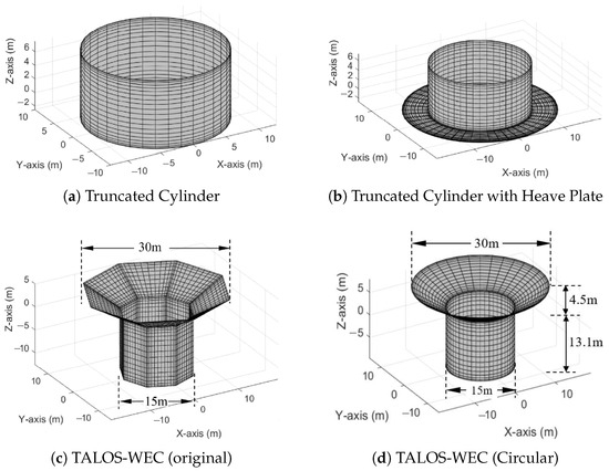 - Sheng, W.; Aggidis, G. Hydrodynamic Comparisons of TALOS Wave Energy Converter Using Panel Methods. In Proceedings of the ISOPE 2023, Ottawa, ON, Canada, 19–23 June 2023; pp. 597–604. [Google Scholar]