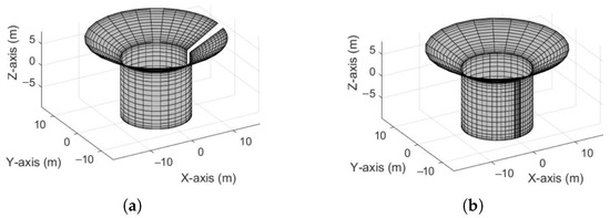 Derived from potential flow theory, the velocity potential satisfies Laplace’s equation , decomposed into components for incident (), diffraction (), and radiation () interactions. The TALOS-WEC’s hydrodynamic behaviour was analysed across six degrees of freedom (surge, sway, heave, roll, pitch, yaw), with specific motions influenced by geometry, mooring systems, and PTO configuration [60].