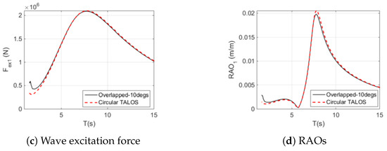Hydrodynamic coefficients are crucial in defining the interaction between the WEC and the surrounding fluid, governing added mass, damping, and excitation forces. Added mass () quantifies increased inertia from water movement, with TALOS showing the highest values in heave () due to strong vertical interaction. Radiation Damping () capture energy dissipation, also highest in heave (), emphasising the importance of radiation effects. Wave excitation forces () drive structural motion, with heave experiencing the largest forces (), highlighting TALOS’s efficiency in vertical energy capture [59].