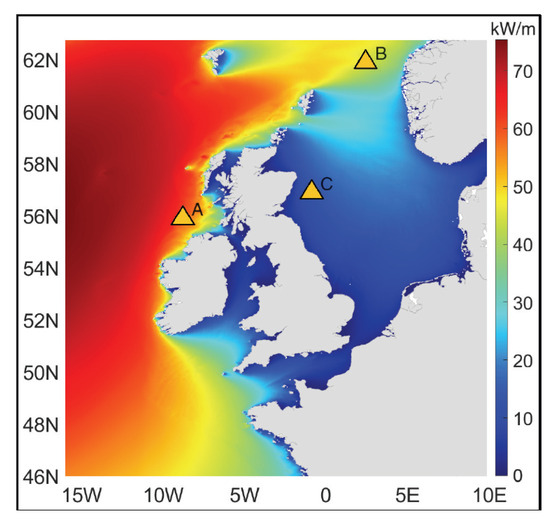 - Rizaev, I.G.; Dorrell, R.M.; Oikonomou, C.L.G.; Tapoglou, E.; Hall, C.; Aggidis, G.A.; Parsons, D.R. Wave Power Resource Dynamics for the Period 1980–2021 in Atlantic Europe’s Northwest Seas. In Proceedings of the 33rd International Ocean and Polar Engineering Conference, Ottawa, ON, Canada, 18–23 June 2023. [Google Scholar]