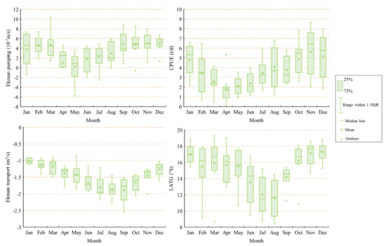 As shown in Figure 1, there were significant monthly variations in Ekman transport and pumping and the CPUE and LATG of D. gigas (p < 0.01, Supplementary File: Table S1). Ekman pumping increased in February, gradually decreased until May, and subsequently gradually increased from June, levelling off in December. Ekman transport (intensity) showed a trend of increasing and then decreasing, reaching its maximum in August. D. gigas CPUE first decreased, reaching below 3 t/d from March to June, subsequently increasing and exceeding 5 t/d from October to January. The LATG of D. gigas showed clear north–south movements, with minor shifts from January to May, with a subsequent northward movement until August, and a southward movement thereafter.
