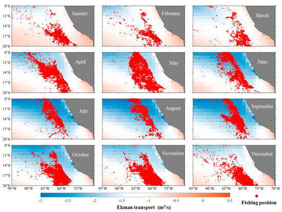 Data were obtained from the China Distant-Water Fisheries Data Center between 2012 and 2020 within the region spanning 8° S to 20° S and 75° W to 95° W [29,34]. This dataset included D. gigas catch volume (in tons), the operational location (latitude and longitude), operation dates, and fishing days (effort). This research primarily investigates the monthly variations in Ekman processes and the influence on Chl-a concentration and, thus, the distribution and abundance of D. gigas off the coast of Peru. All data were analyzed monthly.