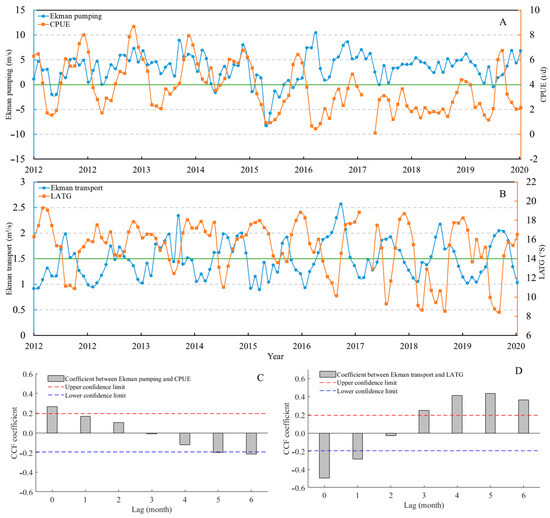 (A): Monthly variations in Ekman pumping and D. gigas CPUE from 2012 to 2020. (B): Monthly variations in Ekman transport intensity and D. gigas LATG from 2012 to 2020. (C): Cross-correlation coefficient between Ekman pumping and D. gigas CPUE. (D): Cross-correlation coefficient between Ekman transport and D. gigas LATG.