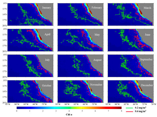 The spatial distribution of Chl-a concentration off the coast of Peru, with the 0.2 and 0.6 mg/m3 isopleths overlaid.