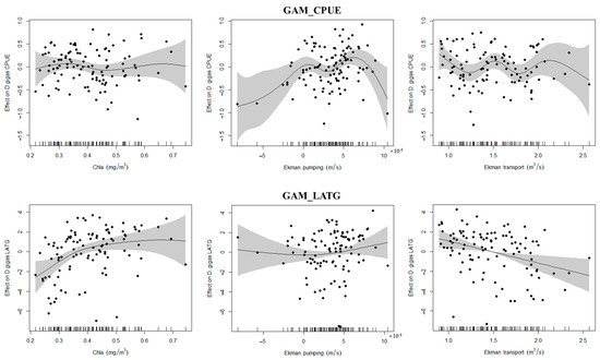 The results indicate that Ekman pumping had a significant impact on D. gigas CPUE (p < 0.01, Supplementary File: Table S2), while Ekman transport and Chl-a significantly affected the D. gigas LATG of (p < 0.01, Supplementary File: S3). Their nonlinear patterns were shown in Figure 7. For D. gigas CPUE, there was a trend of initially increasing and then gradually decreasing with the increase in Ekman pumping. The influence of Chl-a concentration on D. gigas LATG showed a clear positive nonlinear relationship, while Ekman transport had a distinct negative linear relationship with D. gigas LATG.