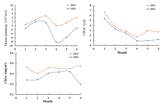 The monthly variation in Ekman pumping, Chl-a concentration, and D. gigas CPUE off Peru from January to June in 2013 and 2016.