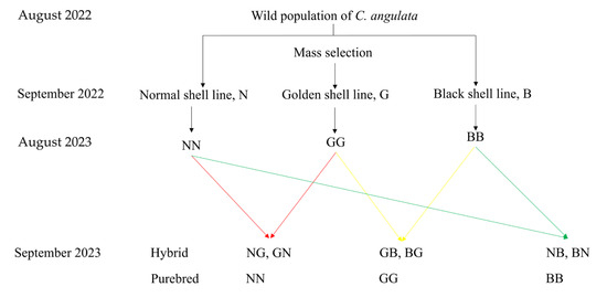 Three sires and three dams were selected from each of the normal (N), golden (G), and black (B) shell lines of C. angulata in August 2023 based on shell color, shell height (N: 61.72 ± 5.41 mm; B: 83.03 ± 10.41 mm; and G: 89.33 ± 5.04 mm) and living weight (N: 70.50 ± 7.36 g; B: 87.15 ± 13.47 g; and G: 90.80 ± 26.01 g). The eggs of every oyster from each line were collected by filtering through 300-mesh sieves and then placed in a 15 L polyethylene plastic bucket for 1 h at a temperature of 27.00 ± 0.5 °C and a salinity of 30.00 ± 1 psu for maturation. Later, the sperm of each male from each line was gathered and also placed in a 15 L polyethylene plastic bucket. Afterwards, the collected sperm and/or eggs were divided into three equal groups for fertilization. A 3 × 3 complete diallel cross was conducted between the normal (N), golden (G), and black (B) shell lines of C. angulata, with eggs from each oyster of each line completing fertilization with the sperm from both the home line and the other two lines, in turn. Therefore, three purebred groups (NN, N♀ × N♂, BB, B♀ × B♂, and GG, G♀ × G♂) and six hybrid groups (NG, N♀ × G♂, NB, N♀ × B♂, GN, G♀ × N♂, GB, G♀ × B♂, BN, B♀ × N♂, BG, and B♀ × G♂) were established (Figure 2). At least 50 spermatozoa were guaranteed to surround each egg during fertilization. Each group was obtained by fertilization with an independent one-pair parent, and three replications of each group were performed. Thus, 27 full-sib families were deployed for this study. All experimental apparatuses used during fertilization, such as sieve nets and buckets, were rinsed with fresh water to prevent any inter-contamination.
