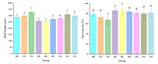 The shell height and survival rate for the nine groups of C. angulata at the larval stage. Different superscript letters indicate significant difference (p < 0.05).
