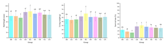 The shell height, living weight, and survival rate for the nine groups of C. angulata in Houhai on day 360. Different superscript letters indicate significant difference (p < 0.05).