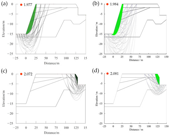 Comparative validation of potential slip surfaces for the 2D stratigraphic model of Zhubi Reef: (a,b) left-side slope; (c,d) right-side slope. Note: (a,c) are adapted from Guo et al. [9]. The black curve and the green area represent the potential slip surface and the critical slip surface, respectively.