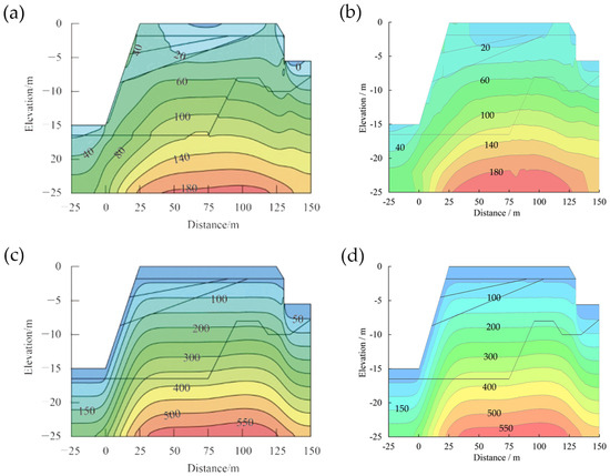 Comparison of the effective stress distribution results for the two-dimensional model of Zhubi Reef: (a,b) horizontal direction; (c,d) vertical direction. Note: (a,c) are adapted from Guo et al. [10].