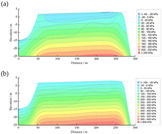 Distribution of effective stress in the reef body under self-weight conditions. (a) horizontal direction; (b) vertical direction.