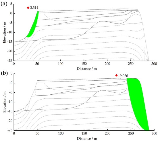 In this study, the Morgenstern–Price method was applied to analyze the slopes on both sides of the reef under self-weight conditions (the lagoon slope on the left and the seaward slope on the right). The results, including the distribution of potential slip surfaces, critical slip surfaces, and safety factors, are shown in Figure 5. The safety factor of the left slope was 3.314, while that of the right slope was 19.026. The critical slip surface of the left slope spanned from the first to the fourth strata, with a horizontal extent of approximately 28 m and a maximum depth of about 10 m. On the right slope, the critical slip surface had a horizontal span of around 42 m and a maximum depth of 40 m. The significantly higher safety factor of the right slope could be attributed to the protective effect of the rock basin structure in the framed reef tuff, which safeguards the middle-inner reef apron. Additionally, the right slope predominantly consisted of the fifth stratum, where the framed reef tuff exhibited superior lithological properties.