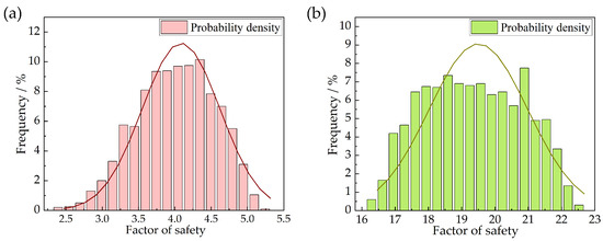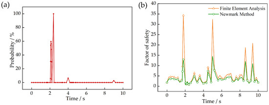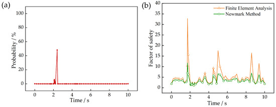 To further investigate the risk of slope instability of the reef body under seismic loading and the probability of slope failure at critical moments during the seismic process, a probabilistic stability analysis was introduced in this paper. Probabilistic stability analysis of the slope was achieved by combining the finite element method with the slope stability method. The finite element model and its assumptions remained consistent with the original model. As shown in Figure 13b, the time-history curve of the safety factor derived from both methods shows a high degree of consistency in terms of the overall trend and the minimum value of the safety factor. However, the finite element method resulted in a significantly higher average safety factor compared to the Newmark method. While both methods follow the same trend for most of the time, the finite element method better reflects the instantaneous dynamic effects, whereas the Newmark method tends to focus more on the overall stability. The finite element method is based on the theory of continuous medium mechanics and calculates the safety factor by analyzing the stress–strain distribution within the slope soil body. It considers the overall response of the slope under seismic loading, particularly capturing local stress concentrations and deformation tendencies. On the other hand, the Newmark method is a simplified rigid-body sliding model that assumes a rigid slip surface and neglects the complex stress and deformation characteristics within the slope when calculating the sliding force. The finite element method is more sensitive than the Newmark method, and the differences in the results highlight the finite element method’s higher sensitivity to local stress concentrations and the dynamic response of the slope. The results from the Newmark method were relatively smooth, primarily reflecting the cumulative effects of the sliding force. The very high safety factor values that appeared several times were due to transient stability enhancements caused by small dynamic forces at specific moments and local stress release on the slope.