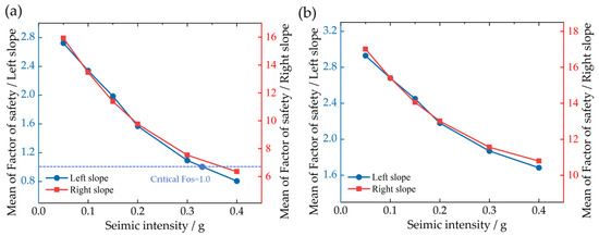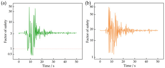 The results for the minimum average factor of safety are shown in Figure 7b. The decreasing trend in the slope’s factor of safety aligns with the decline in the minimum factor of safety. Under the highest-intensity earthquakes in this analysis, the left- and right-side slope have decreased by 48.7% and 42.1%, respectively. However, the minimum average safety factor of the reef slope remained above the critical instability value under all seismic conditions. For the left slope, the minimum average safety factor under the six seismic intensities (from weak to strong) ranged from 1.6 to 2.7 times the critical value. For the right slope, the minimum average safety factor under the same range of seismic intensities ranged from 10.9 to 17.1 times the critical value. This indicates that, overall, the slope’s stability was slightly higher than the critical instability threshold during the seismic event and remained in a stable state. Nevertheless, the risk of instability during the peak acceleration intervals of the seismic event should be carefully considered and analyzed.
