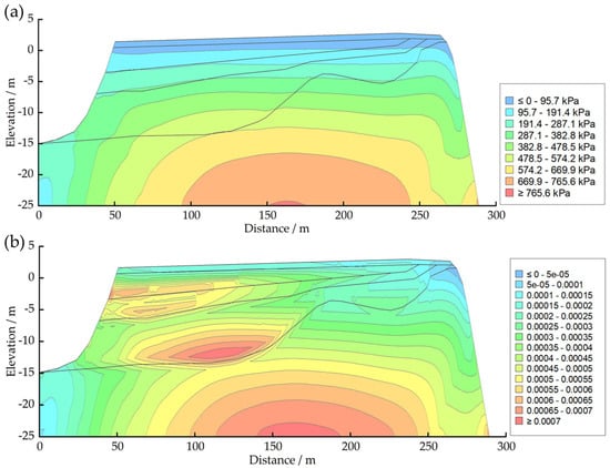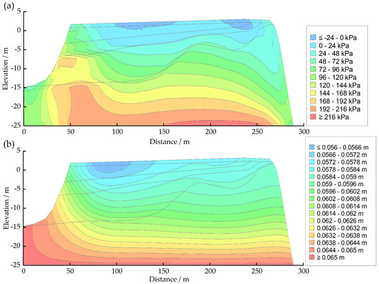 Distribution of horizontal effective stress field and displacement at 2.4 s of the PGA 0.4 g earthquake; (a) horizontal effective stress; (b) displacement.