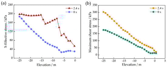 Relationship between horizontal effective stress, maximum shear stress, and depth at X = 50 m at 2.4 s of the earthquake; (a) horizontal effective stress; (b) maximum shear.