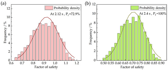 Under the influence of the PGA 0.4 g seismic wave, the results show that the highest probability of instability, 100%, occurred during the time period from 2.0 to 2.4 s, which aligns with the most hazardous moment identified in the traditional analysis (shown in Figure 13). The above computational results are based on the model assumptions established in this study; however, the extremely high instability predictions also indicate that the coral reef multi-layered slope site faced a significantly high risk of damage under seismic conditions with a PGA greater than 0.4 g. The left slope, under the seismic intensity of PGA 0.4 g, reached its peak sliding damage during this period (the slip surface is shown in Figure 10 of Section 4.2.2). Figure 14 illustrates the probability density function and the normal distribution curve of the slope safety factor at the most critical moment during an earthquake with a peak ground acceleration of 0.4 g.