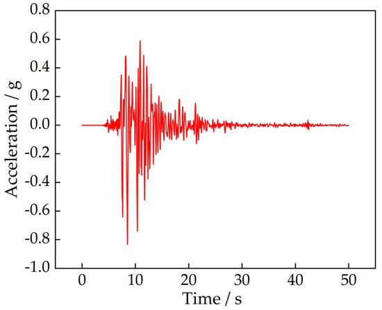 In order to further assess the stability of reef body slopes under extreme seismic conditions, this paper introduced an actual observed seismic wave (shown in Figure 15) as an input load, building on analyses conducted using synthetic seismic waves. This study selected the 1995 Kobe earthquake wave as the extreme condition seismic wave, which is characterized by long duration and extreme intensity. It was extracted from actual monitoring data and represents the characteristics of strong earthquakes in seismically active regions. The Kobe earthquake wave features multi-frequency components and long duration, enabling it to more accurately reflect the complex ground motion characteristics under strong seismic conditions. Compared to typical synthetic seismic waves, the use of the Kobe earthquake wave better captures the uncertainty and complexity of seismic loading in real earthquake events, such as the time-history characteristics of peak ground acceleration and the impact of multi-frequency properties on slope stress distribution and permanent displacement. Synthetic seismic waves, typically based on simplified source models and site conditions, may not fully capture the multi-frequency and non-stationary characteristics of actual earthquakes [36].