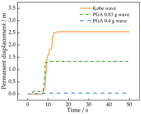 The permanent displacement caused by the earthquake was calculated while using the Newmark method to determine the effect on the safety factor. The results showed that the acceleration response value of the right-side slope under the influence of this seismic wave did not exceed the critical acceleration, and no permanent displacement occurred. We focused on analyzing the cumulative permanent displacement characteristics of the left slope. Due to the multi-frequency components and long duration of the observed Kobe seismic wave, comparing its displacement patterns with those generated by synthetic seismic waves can provide clearer insights into permanent displacement analysis. Therefore, we synthesized an artificial seismic wave with the same peak ground acceleration (PGA) as the Kobe wave and analyzed the cumulative permanent displacement characteristics of the left slope under seismic influence, combined with a PGA 0.4 g seismic wave. The results show that under the influence of the Kobe wave, the left slope accumulated approximately 2.5 m of permanent displacement. Under the influence of the artificial wave with PGA 0.83 g, the cumulative permanent displacement was about 1.3 m, while under the influence of the artificial wave with PGA 0.4 g, the cumulative permanent displacement was 0.038 m (Shown in Figure 17).