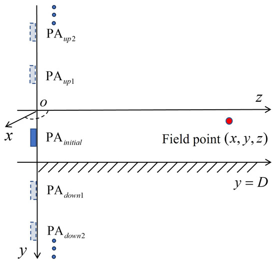 A three-dimensional rectangular coordinate system is established, as shown in Figure 1, where the plane is the upper interface of the waveguide, direction y is the depth direction of the waveguide, plane is the lower interface, and D is the total depth of the waveguide. The PA sound source (blue rectangle in Figure 1) is at depth , its radiant plane coincides with the plane, and the direction of the sound axis is parallel to the z-axis. The side lengths of the PA in the x and y directions are and , respectively. In this study, we assume that the waveguide interface is statically smooth, so the image source method can be used.