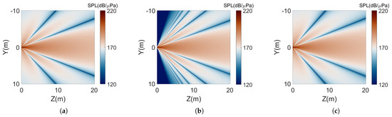 In the simulation, the HFW with frequency is taken as the research object. The numerical solution of the RI model is obtained by gradually reducing the integral step of the sound source surface. The result converges when the sound pressure level (SPL) error is less than 0.1 dB. Finally, the integral step of the RI method is . The sound pressure level (SPL) distribution calculated by the three models is shown in Figure 2, where the cross-section is taken for analysis. In the free field, the HFW directly radiated by a finite-size piston sound source will form a directional beam with a sidelobe in space, consistent with the results in Figure 2. By comparing Figure 2a,b, it can be found that the HFW sound field obtained by the conventional GBE method has apparent errors in the wide-angle position. By comparing Figure 2a,c, it can be found that the sound field calculated by the non-paraxial model is closer to the exact solution than that calculated by the conventional GBE model, especially at the wide-angle position away from the sound axis.