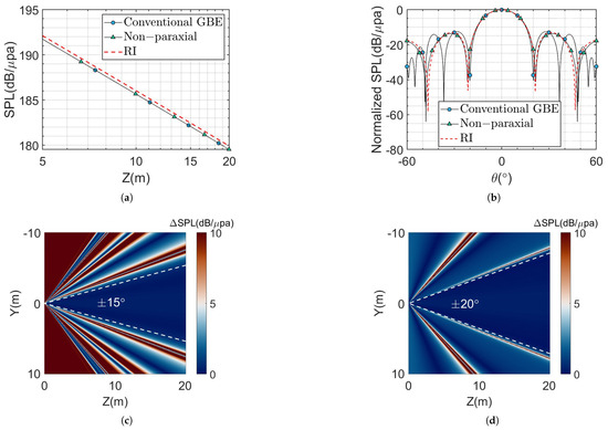 We calculate the axial SPL, sound vertical directivities at 10 m from the source, and the errors between them and the exact solution, as shown in Figure 3, where the SPL error is defined as . Figure 3a shows that the HFW follows the spherical wave attenuation rule, and Figure 3b shows that it has sharp directivity but also has sidelobe. According to the analysis in Section 2, the calculation results of the non-paraxial model and the conventional GBE model on the sound axis are the same. In Figure 3b, the directivity calculated by the non-paraxial model is very consistent with the exact RI solution within the range of and is basically consistent with the larger angle, while the results of the conventional GBE model have errors within , and the errors gradually become larger as the angle increases.