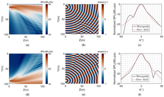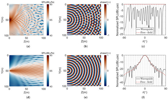 Because of the sharp directivity of the DFW beam, when the distance between the sound source and the waveguide boundary is far, the beam does not fully interact with the boundary, resulting in the sound field near the sound axis not changing significantly and the vertical directivity of the sound field is not much different from that of the free field. In order to further study the influence of the waveguide boundary, the distribution of the DFW sound fields generated by PA sound sources close to the upper and lower interfaces of the waveguide is calculated, respectively, and the results are shown in Figure 5. By comparing Figure 5a,c,d,f, it can be found that when the sound source is close to the waveguide boundary, the DFW beam will be significantly affected by the boundary, and whether it is an “absolutely soft” boundary or an “absolutely hard” boundary, the beam will show sidelobe in the region near the boundary, and cause the vertical directivity to lose symmetry. Figure 5b,e show that the spatial phase of the DFW radiated by the PA sound source at different depths is more obviously affected by the interface away from the sound source side and thus produces chaotic oscillating fringes.