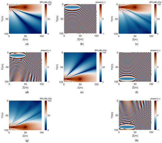 As shown in Figure 6a,c,e,g, the amplitude distribution of the integrand function has a greater weight in the center of the sound source radiation plane and the field point, and Figure 6b,f show that the phase of the integrand function is relatively uniform in the area near the “source-field point line” connected between the field point and the center of the sound source radiation plane. At the same time, violent oscillations will occur outside the region, indicating that the “source-field point line” region is the key region for virtual sound source accumulation, and any small change in this region will significantly impact the final DFW sound field distribution. Figure 6d,h show that waveguide boundaries can disrupt the phase uniformity of the region, especially near the sound source. The phenomenon that the waveguide boundary causes the sidelobe of the DFW beam can be attributed to the fact that the influence of the waveguide boundary changes the phase distribution of the integrated function, so the existence of the waveguide boundary will affect the accumulation of virtual sources in the observation region, and thus affect the final distribution of the nonlinear sound field.