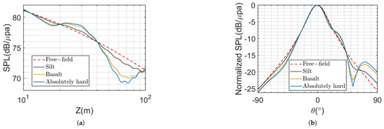 Assuming that the sound velocity of air medium , the density , and the parameters of the water medium are the same as in Section 3.1, the acoustic parameters of the riverbed medium (made of basalt or silt) are derived from [28], and the depth of the sound source is 90 m. The reflection coefficient of the air–water boundary is , and that of the water–riverbed boundary is 0.8086 (basalt) and 0.2819 (silt), respectively. The axial SPL distribution at the impedance interface and the vertical directivity of the DFW sound field 10 m away from the sound source are obtained by simulation. At the same time, the results of the free-field case and ideal absolutely hard boundary are also shown in Figure 7 as a reference.