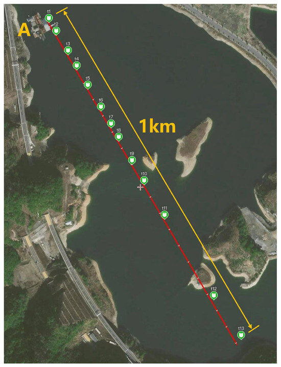 Figure 8 marks the location of the measuring points selected in the experiment. The distance between the 13 measuring points and the sound source from near to far in the direction of the sound axis is shown in Table 2. In the experiment, the sound source is placed at the water depth of 5 m below platform A to transmit a dual-frequency modulated signal to generate a nonlinear sound field in space, and then the vertical array is placed at each measuring point to the water depth of 5 m to receive the sound signal (the depth of the central array element is 5 m).