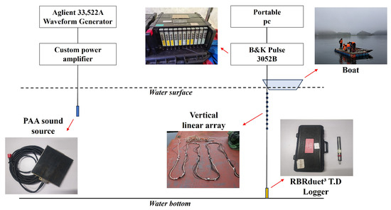 We conducted experiments in the waters of Qiandao Lake, as shown in Figure 8, to further verify the validity of the proposed model. The PA sound source used in the experiment is a custom rectangular piston transducer. The receiving system consists of a nine-element vertical linear array of RESON TC4013 hydrophones and a PULSE analyzer (Brüel & Kjær Type 3052, Naerum, Denmark) placed on a movable boat, where the element of the vertical array is 0.75 m apart. The instrument connection is shown in Figure 9.