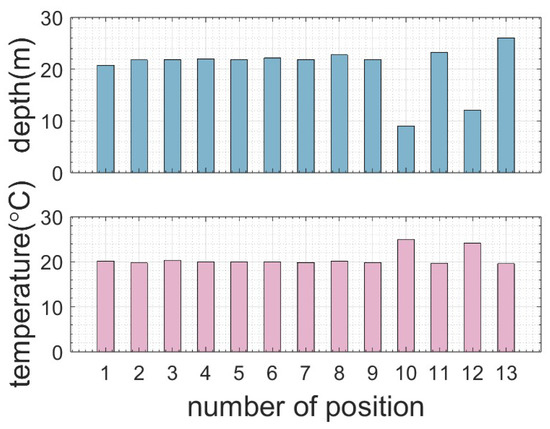 In addition, the RBRduet³ T.D logger measures the water depth and temperature at each measuring point the boat moves to. Figure 10 shows the data recorded by the logger. The average water depth of the first nine measuring points is about 22 m, and the average water temperature is about 20 °C. From the 10th measuring point, the depth and water temperature fluctuate considerably.