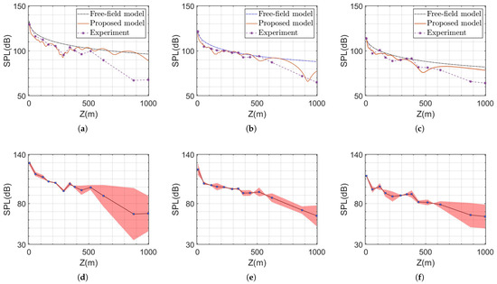 The sound field pressure data are obtained by analyzing and processing the collected signal. The DFW sound field in water with a width of 60 m, a depth of 22 m and a length of 1000 m is simulated according to the proposed model combined with experimental emission parameters and environmental parameters. Firstly, the axial SPL distribution of the DFW sound field between simulation and measurement is compared. The error between the simulation results of the proposed model and the experimental data is calculated, and the error shadow distribution is drawn (Figure 11d,e,f represent the experimental data by blue dots, and the red area is the error shadow between the calculated results of the proposed model and the experimental data). At the same time, the results calculated by the free-field model are taken as a reference, and the results are shown in Figure 11.