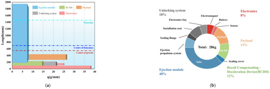 The total weight of the unpowered vehicle is 28 kg, with the longitudinal distribution of the weights of the main components shown in Figure 3a. The figure identifies the center of gravity (CG), the center of buoyancy (CB), and the waterline position. As illustrated in Figure 3b, the ejection component represents the highest weight, constituting 48% of the total, followed by the unlocking system, the payload, and the RCDD.