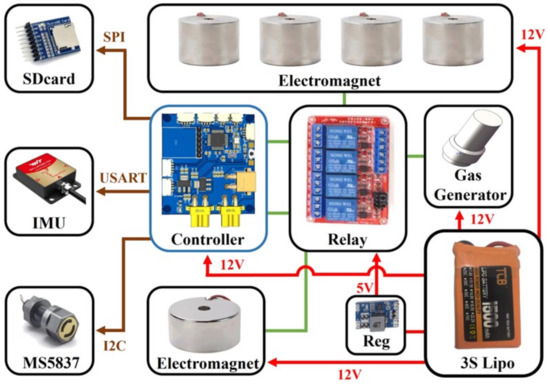 The electronic system of the unpowered vehicle is mainly made up of a power module, a controller, and various sensors. The controller is integrated with an STM32 microcontroller and multiple interfaces. Four relays are connected to the controller GPIO ports, with each controlling the ejection module and the two-part unlocking system. The controller is also connected to independent sensors: depth is measured using a miniature pressure sensor (MS5837), which is verified for a resolution and accuracy of 1 cm, and the Inertial Measurement Unit (IMU) is the HWT605, with an accuracy of 0.05°; the former requires the I2C protocol, while the latter communicates via USART serial ports. Underwater data storage is facilitated by an SD card, which communicates via the SPI protocol. The power supply for the unpowered vehicle is provided by a 1500 mAh 3S Lipo battery. The connections of the components are illustrated in Figure 5, with red representing power and green representing signals. In this project, the controller was pre-programmed for underwater operation; upon detecting the received depth and attitude data, the controller performs data recording, unlocking, and launch for the unpowered vehicle.