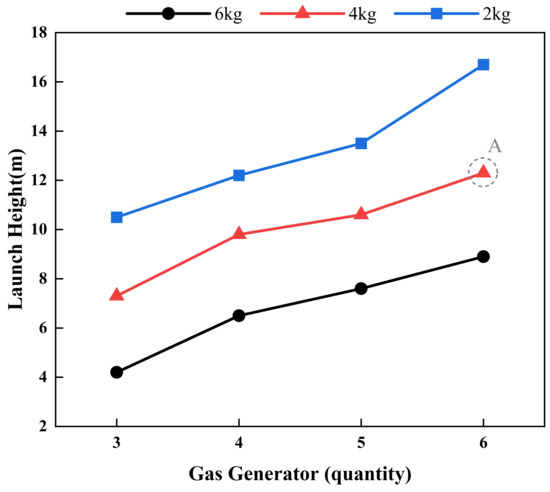 The experiments were carried out using the local atmospheric pressure value of 909 mbar from the test day, with equivalent loads ranging from 2 to 6 kg. The results are presented in Figure 6. The experiments were carried out using a launch tube with a length of 1580 mm. The data charts presented in the results provide a detailed depiction of the heights achieved during the ejection tests under the actual testing conditions, using between three and six gas generators for equivalent loads of various masses (2–6 kg). To ensure the reference value of the experiments, subsequent trials were conducted using the gas generator quantity and payload weight at point A.