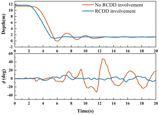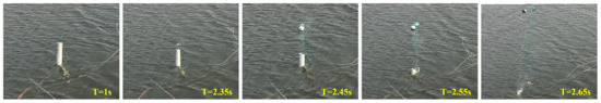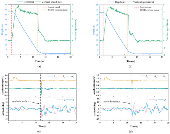 To ascertain the operational performance of the RCDD in real-world conditions, comparative assessments and tests were carried out during the ascent phase in a genuine marine environment. The intervention of the RCDD significantly reduced the time required to stably adjust to the water’s surface attitude. As shown in Figure 12, in the absence of the RCDD, the vehicle took 7.72 s of the duration of its appearance above the water’s surface (T = 5.29 s) to achieve stable floating on the water’s surface (T = 13.01 s). As shown in Figure 13, in an environment nearly identical to the one with the RCDD involved, the unpowered vehicle achieved stable floating on the water’s surface in a time span of 5.03 to 6.58 s, requiring only 1.55 s, which represents a reduction of almost 80%. The results of these tests are illustrated in Figure 14.