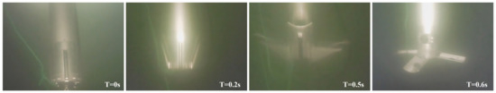 In order to investigate and analyze the results of the aforementioned experiments, due to the constraints imposed by underwater filming conditions, photographs of the moment at which the RCDD was deployed were captured in a laboratory water pool, as depicted in Figure 18. These images were provided only for illustrative purposes and did not influence the results of the marine and lake tests. The RCDD achieves full deployment in 0.6 s. During the process of adjusting its posture at the water surface, the RCDD unfolds at a pre-set depth, which inevitably reduces the velocity of the unpowered vehicle underwater. During the launch phase, upon deployment, the RCDD increases its contact area with water, as estimated in Section 4.1, by approximately five times. However, the device’s intervention notably enhanced the stability of the unpowered vehicle on the water’s surface, thereby significantly reducing the overall duration of the cross-domain phase.