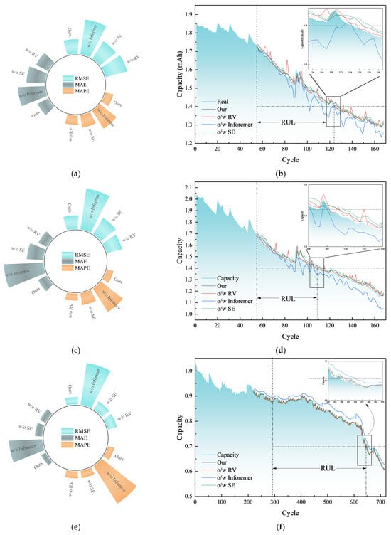 Ablation experiments verified the contribution of each module to the overall model performance. For instance, on the B0005 dataset, removing the RIME-VMD module decreased from 0.9851 to 0.9656 and increased MAPE from 0.00837 to 0.00968, demonstrating the module’s effectiveness in signal decomposition and noise reduction for high-quality input features. Removing the SEAttention module increased the MAPE on the B0005 dataset from 0.00837 to 0.01316, highlighting its critical role in strengthening key multimodal features. Replacing the Informer with a standard Transformer caused on the CS2_36 dataset to drop from 0.9958 to 0.7835, with MAPE rising from 0.00586 to 0.04243, underscoring Informer’s core role in long-term dependency modeling.