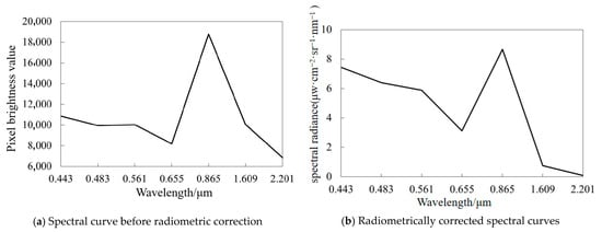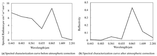 Atmospheric correction can obtain the real spectral information of the object surface. This study adopted the FLAASH atmospheric correction method in ENVI and applied the MODTRAN4+ model for atmospheric correction. Figure 3a presents the spectral curve of vegetation pixels before Landsat 8 atmospheric correction, and Figure 3b presents the spectral curve of vegetation pixels after Landsat 8 atmospheric correction. The spectral curves of vegetation after atmospheric correction show the features of sub-reflective peaks in the green band, reflective valleys in red band, and reflective peaks in the near-infrared band, which verifies the correctness of the atmospheric correction.