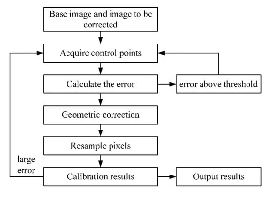 The geometric correction in this study uses polynomial geometric correction, which is based on the principle of using parity to correct the error between the image coordinates of a control point and the image coordinates of its homonymous point.