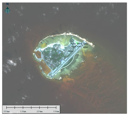 Geometric correction is the process of eliminating or correcting geometric errors caused by various factors in remote sensing imaging through a series of mathematical models. This technology can reduce classification errors. A Landsat remote sensing image of 2021 was used as the baseline, and the relative geometric correction was applied to the image data of other years. Obvious and comparable feature points were selected as control points. In this study, the road edges of the runway of the airport on Yongxing Island and other obvious building roads were selected as the control points, and the points were selected uniformly. Although the runway of Yongxing Island Airport was expanded from 1990 to 2014, with its current length being 3000 m, the road edges of the main control points were not affected by this expansion. The geometric correction process is shown in Figure 4.